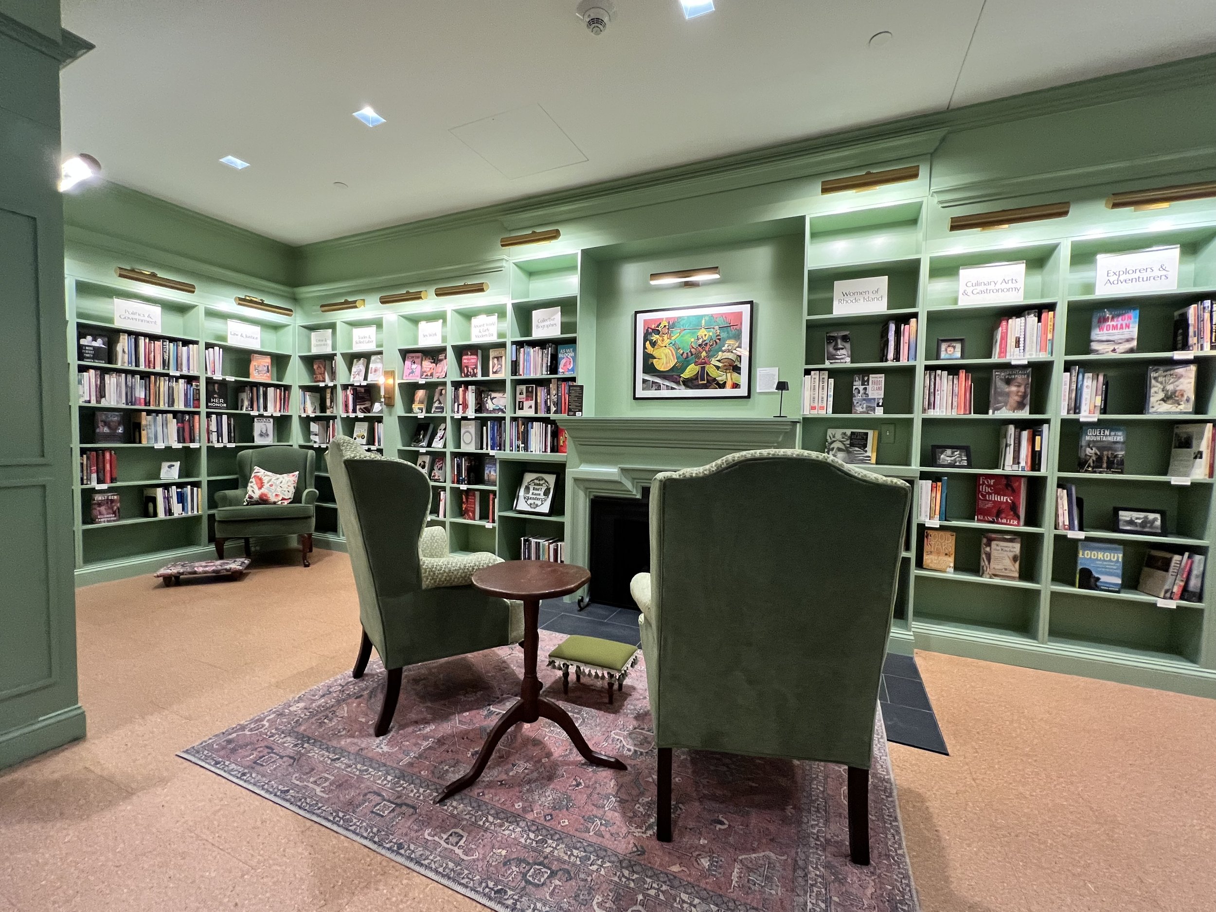 Beyond the gallery, a corridor of pale green book cases unfolds into a generous library centered around a fireplace flanked by wingback chairs. The library has space for some 7,000 volumes and a niche in the wall provides another venue for a rotating artwork display. Members of The Alcove can check out books and can reserve meeting rooms to gather for conversation. The facility combines a variety of spaces into a cohesive whole with an overarching goal of making space for people to connect.