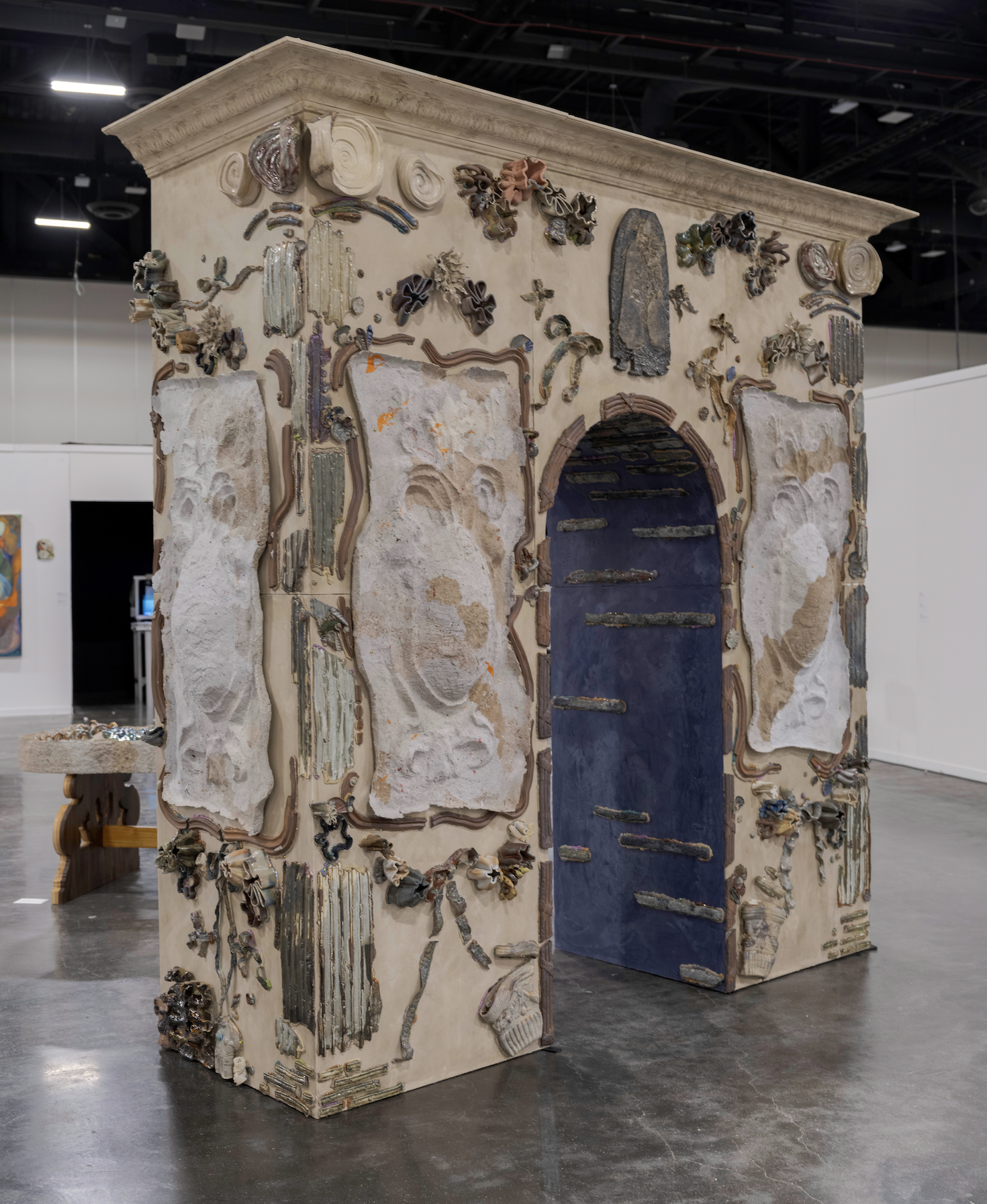 Popescu studied sculpture in undergrad and made a name for herself in New York as a person who mounted events before coming to Rhode Island to earn her MFA in Ceramics at RISD. One of the works on view at OPEN is a large scale arch, crafted during her graduate work, that blends sculpture and ceramic. Asked what she aims for people to gain from interacting with her work, Popescu says, “I hope viewers experience the work first on a bodily level. The Arch is meant to feel imposing at first, echoing the authority and spectacle of historical monuments. But as you move closer and pass through it, that certainty starts to break down. Details, fractures, and the exposed back of the structure invite a slower, more attentive way of looking and point to the labor and construction usually hidden behind grand façades and maximalist ornamentation.”