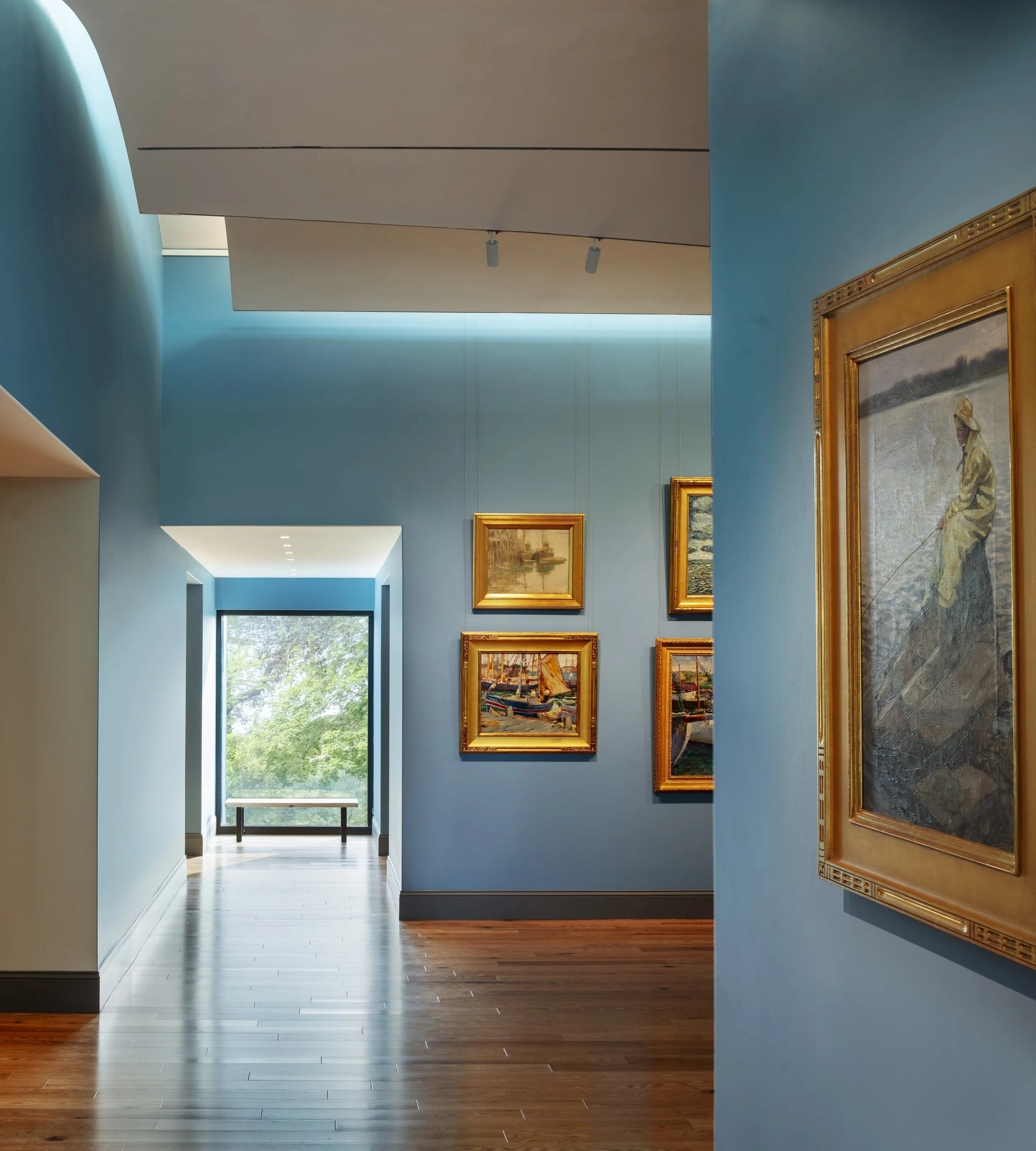 A canopy-like ceiling and cool-toned walls highlight paintings at the Westerly Museum of American Impressionism. Photo by Warren Jagger.