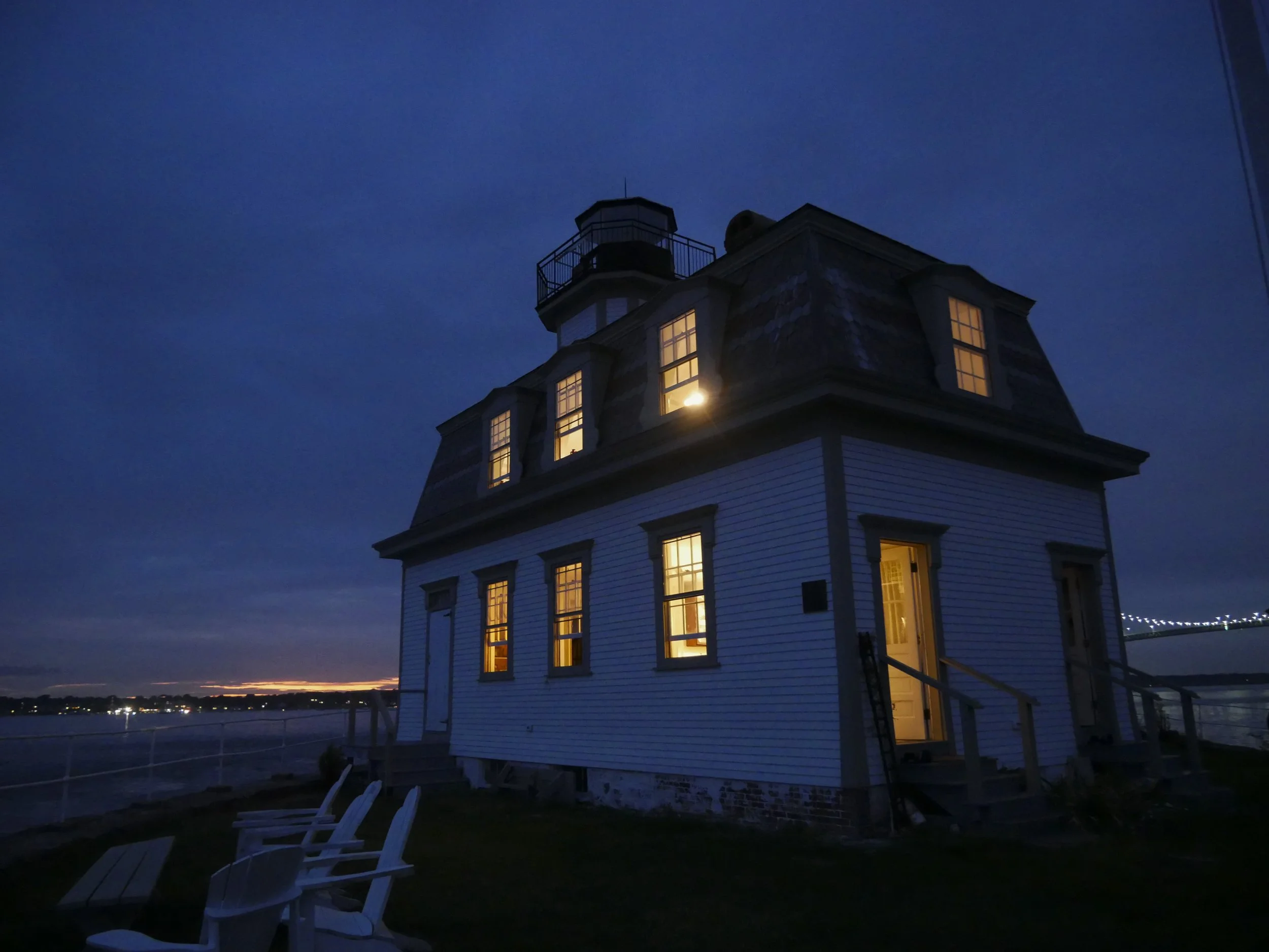 A shot of Rose Island’s historic lighthouse at dusk. Photo by Annie Tuthill, courtesy of Rose Island.